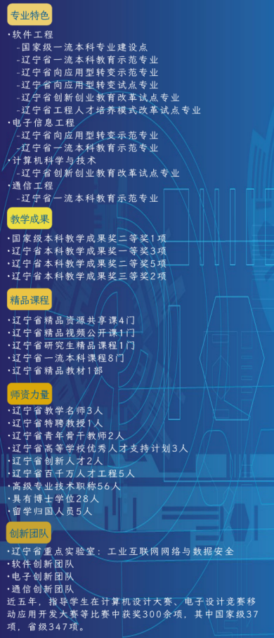 软件工程专业为国家级一流本科专业建设点、辽宁省一流本科教育示范专业、辽宁省应用型转型试点专业、辽宁省应用型转型示范专业、辽宁省工程化人才培养模式改革试点专业,2010年招收留学本科生。