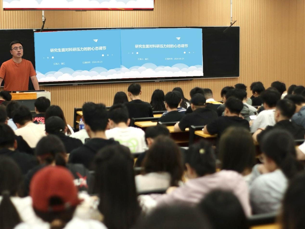 奚汇老师为全体研究生开展主题为“研究生面对科研压力时的心态调节”的心理健康教育讲座。讲座通过压力来源剖析,引导同学们正确认知压力,合理评估压力,积极面对压力。奚汇老师会上也讲解了心理疾病自测标准,出现压力过大甚至心理健康问题时,引导学生学会自我调控,需求支持与建立社交网络,培养兴趣爱好,加强体育运动,帮助学生建立多渠道压力缓解方式,促进学生不断提高自我进步的内驱力。