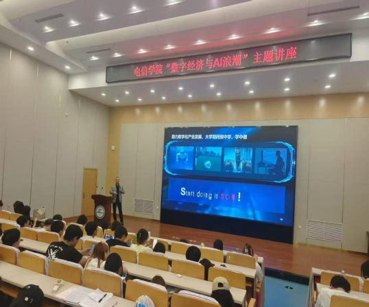 于6月11日下午在5号楼201室举办“数字经济与AI浪潮”主题讲座。本次讲座特邀中软国际教育集团项目总监陈伟俊担任主讲人,近170名电信学子参加此次活动。