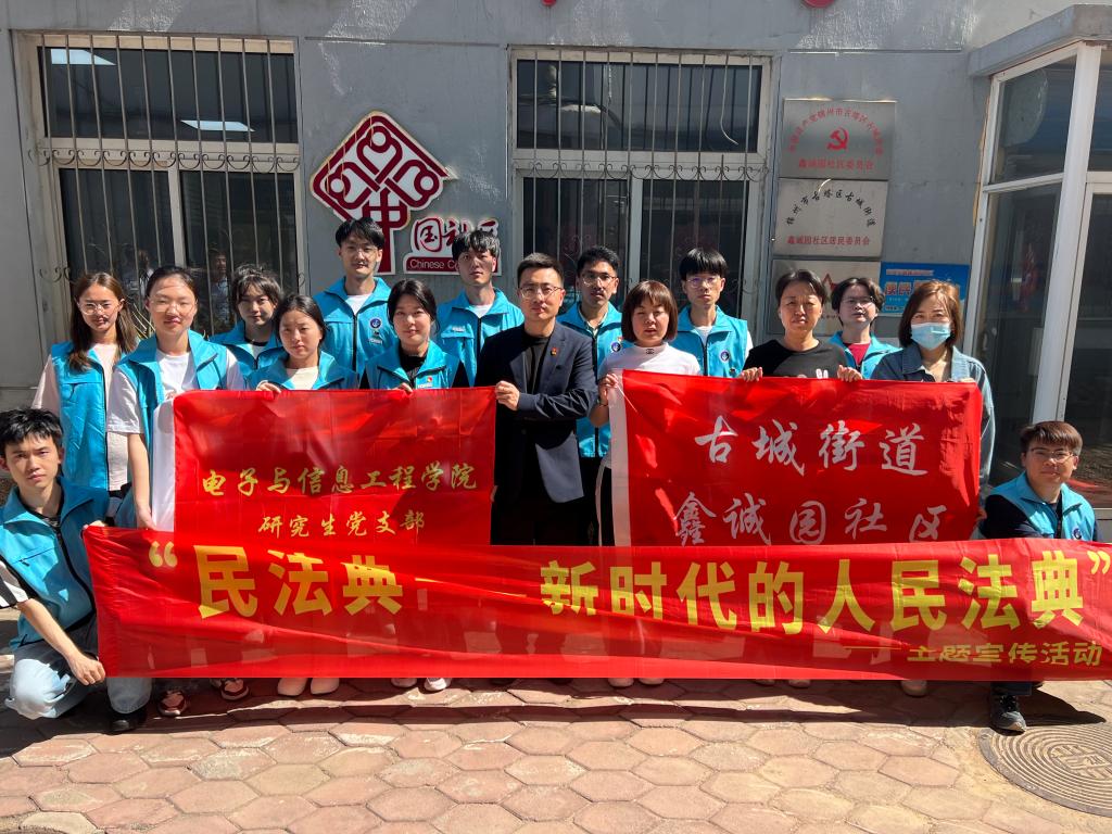 研究生党支部赴古城街道鑫诚园社区开展民法典宣传活动。社区书记刘鑫鑫、研究生党支部书记奚汇、居民和研究生党员代表参加了活动。
